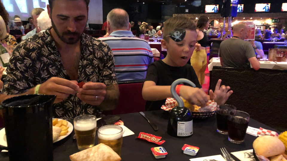 Outside the theatre, there is a plenty of free parking, but as it is such a popular experience, it is best to get there early, especially on sell out nights. Don't worry though, there is other parking available in the area to. The Box Office where you collect your tickets, is found on the entrance to the outside waiting area, and this is where the entertainment starts! First you are offered the opportunity to buy your very own Pirate bag, complete with weapons (plastic don't worry haha), pirates earing (child friendly), pirate spyglass, hook and treasure (chocolate coins haha)! The cost for one of these is €15, so we went for just one, so that the children could share and get excited. Before you start to make your way to the front door, the photographer will snap some different photos of you all, with no obligation to buy, in front of the cool Pirates wall. There is no flash photography inside the theatre, to protect the performers. One flash during their performance, could distract them and cause a serious accident but don't worry, because if you want some photos inside, the photographer comes around after food and before the show, to snap some more! You don't have to go searching for these at the end of the show though...the staff come around with several different photos taken from the night, printed in a lovely Pirate frame. You can purchase these there and then if you like, but again, there is no obligation to buy!